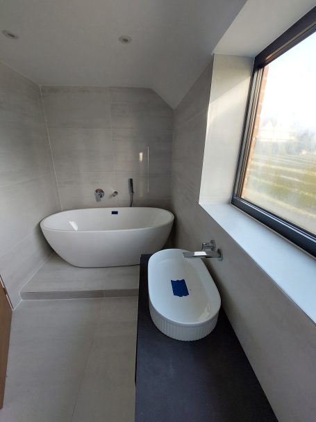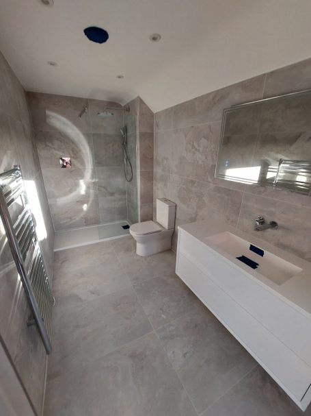 Large family bathroom with free standing bath, walk in shower and floating vanity unit.