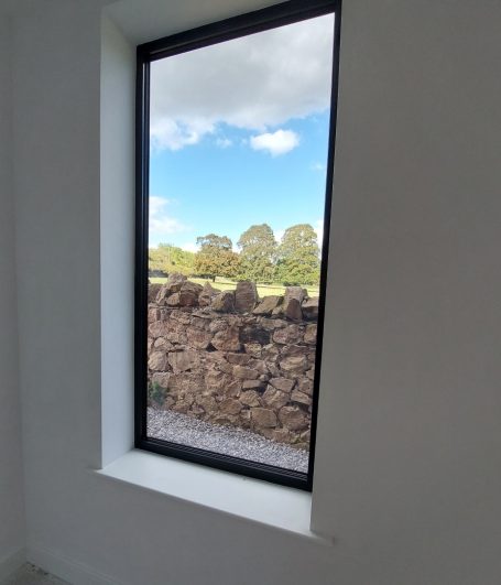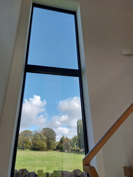 Spacious hallway with a double height floor to ceiling window looking out on to open fields.